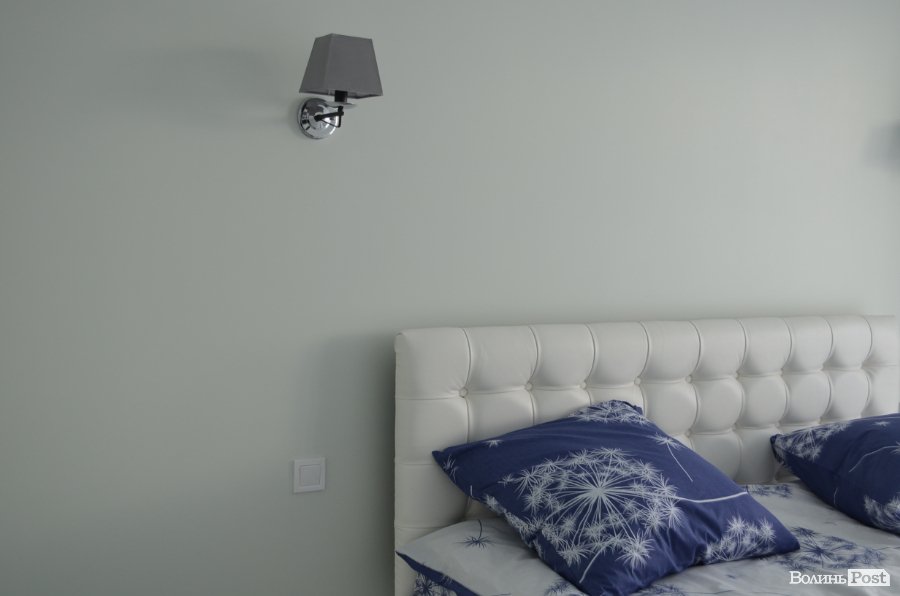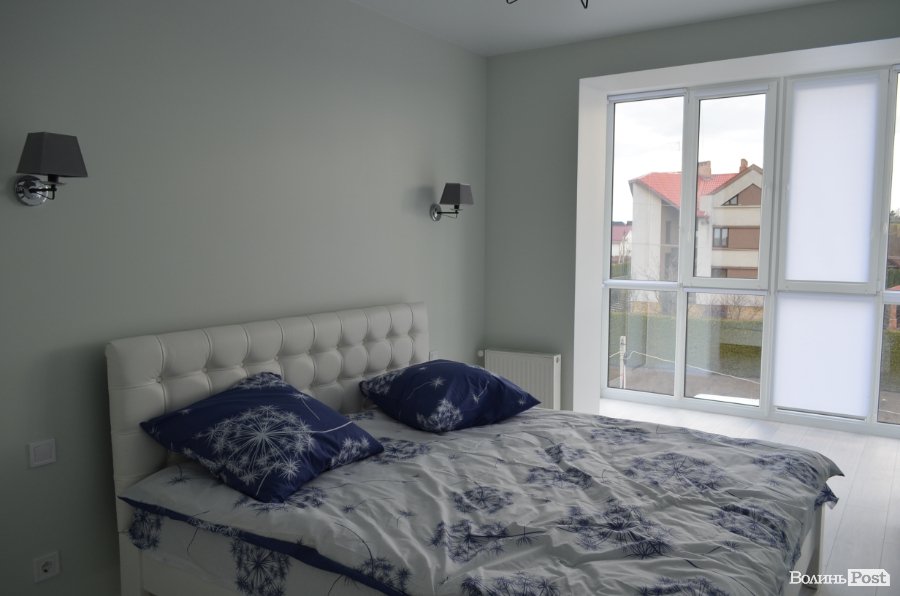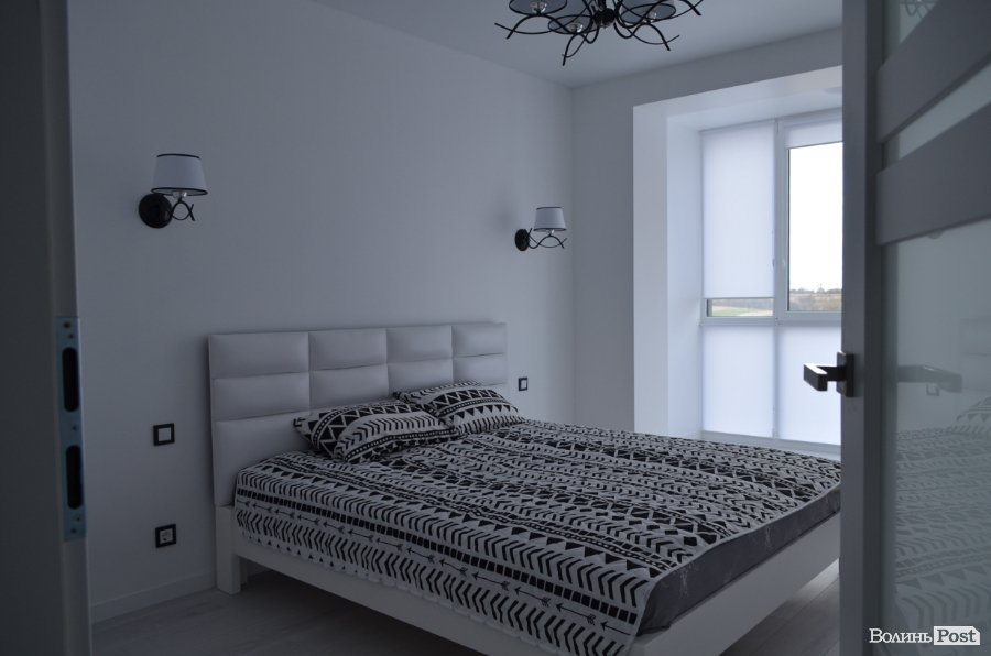 У спальні встановили двоспальне ліжко з комфортним матрацом. У подарунок щасливий власник помешкання отримає приємний подарунок – комплект постілі.