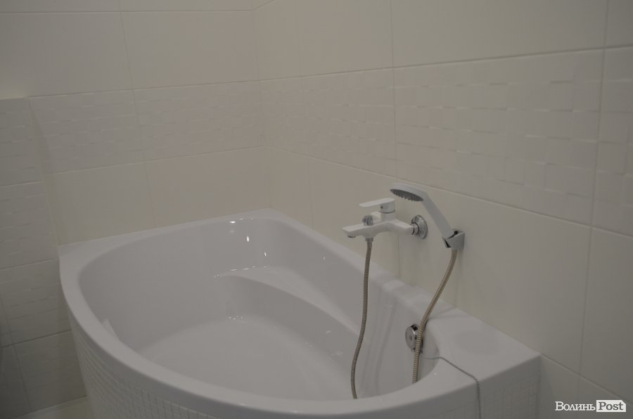 Ванна кімната обладнана умивальником, туалетом, чималою ванною, а також пральною машиною і дзеркалом.