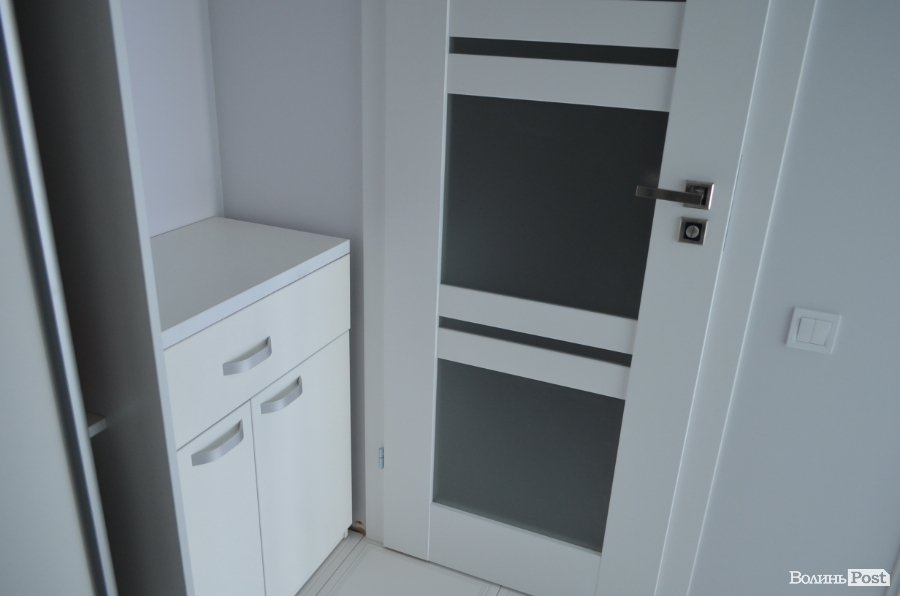 У коридорі встановили велику шафу-купе та комод з якісного профілю та фурнітурою Linken System, котрі також зробили на замовлення у перевірених майстрів.