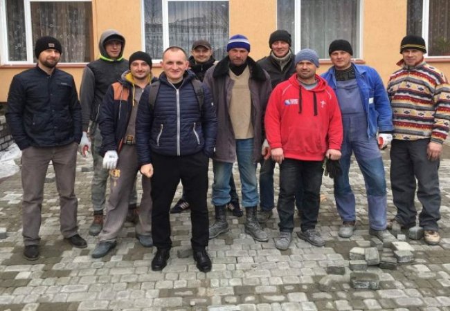 Роман Войчик (волонтер з Каменя-Каширського), Мовчан Віктор (координатор благодійного проекту), Володимир і Андрій Оліщуки, бригада волонтерів, що здійнювала монтаж бруківки