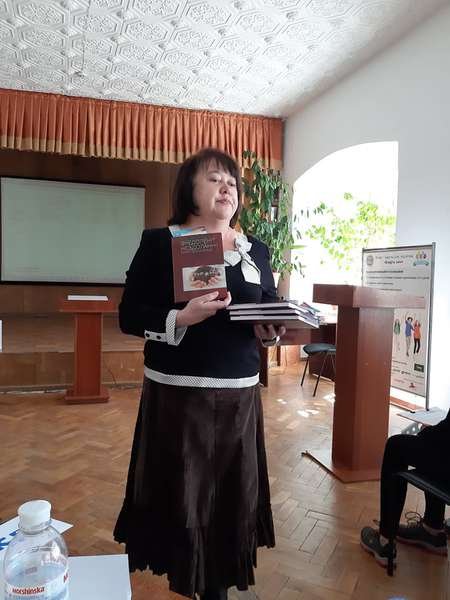 Організатор проекту Аза Голощапова від громадської організації «Переселенці Криму та Донбасу» вручила членам журі книги «Знедолені? Нездоланні!».