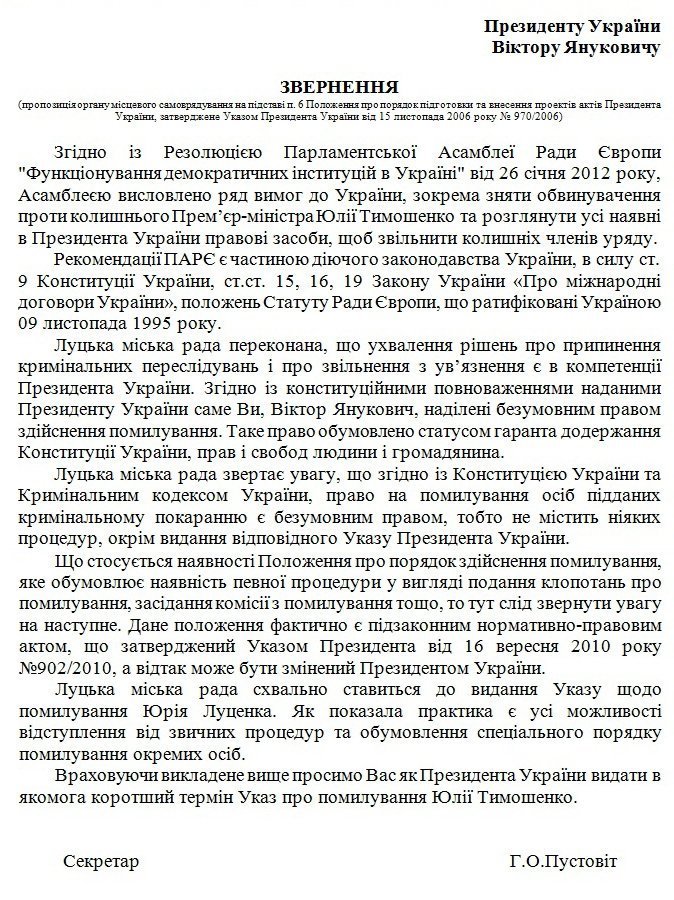 Луцькрада може попросити Януковича за Тимошенко