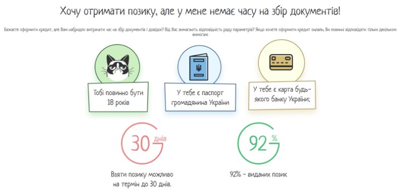 МФО більш лояльні до клієнтів, ніж банківські організації. Взяти кредит онлайн може будь-який повнолітній громадянин України, у якого є паспорт та ідентифікаційний код. Поручителі та застава, довідки, що підтверджують наявність стабільного доходу та офіційного місця роботи, не потрібні.