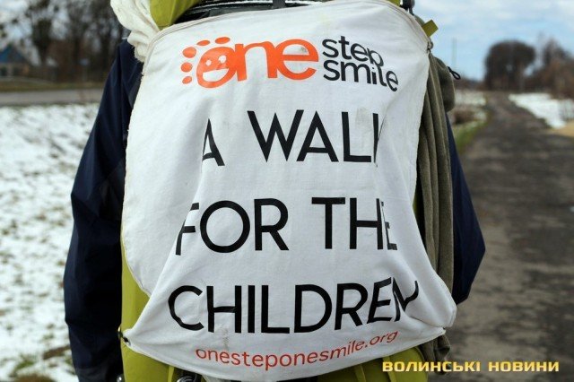 Він ішов з великим дорожнім рюкзаком, в окулярах, а також з палицями для скандинавської ходьби. На рюкзаку напис: «One step, one smile. A walk for the children».
