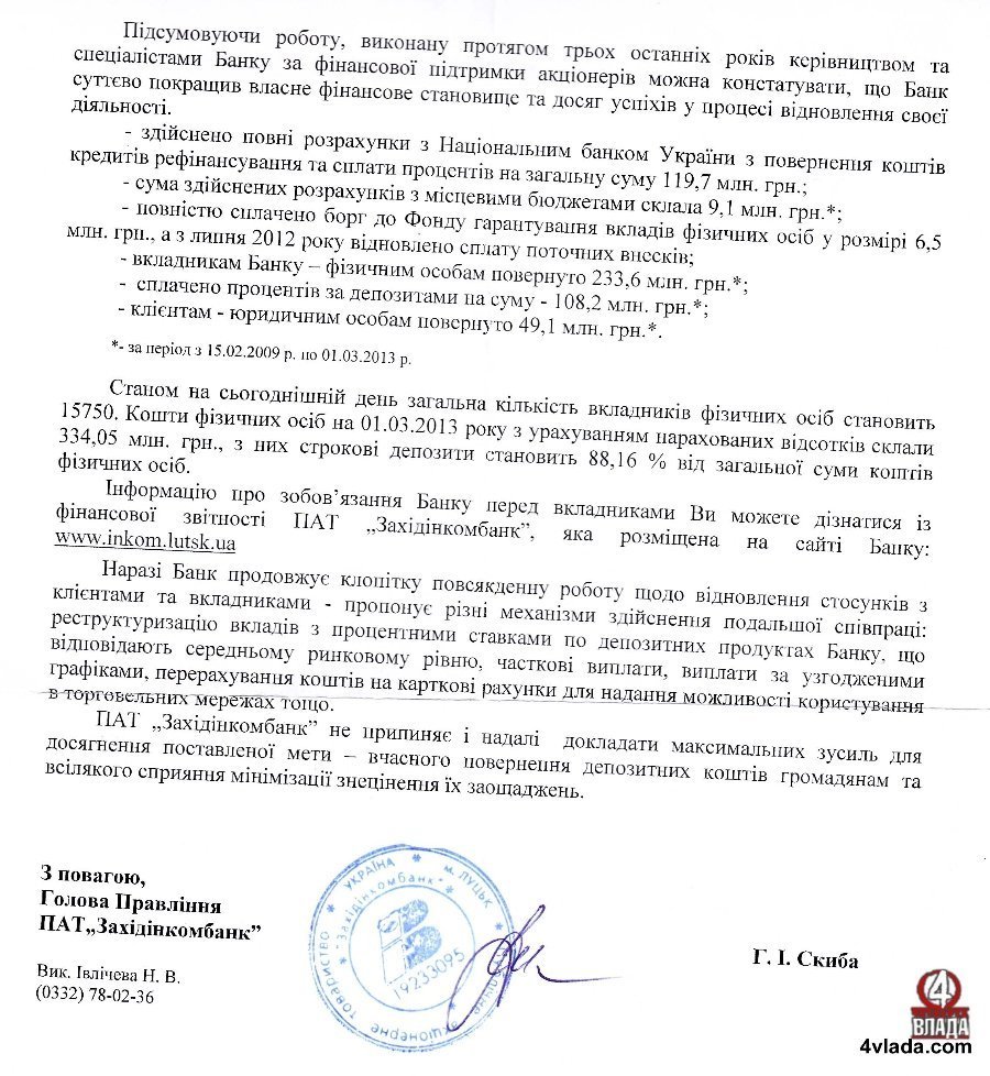 Портал ЧЕТВЕРТА ВЛАДА звернувся до правління ПАТ «Західінкомбанк» із запитом, аби дізнатися про вжиті заходи та суму заборгованих перед вкладниками коштів.