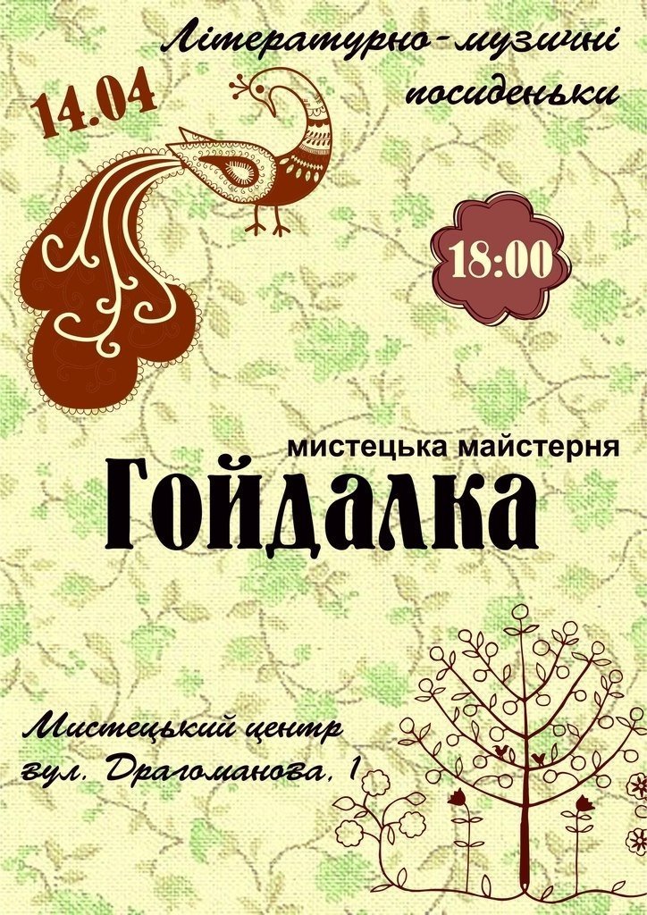 Вони візьмуть участь у весняних літературно-музичних посиденьках, які відбудуться 14 квітня у мистецькому центрі, що на вулиці Драгоманова, 1, - повідомили організатори.