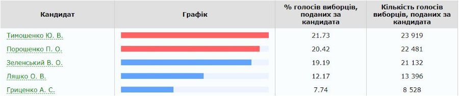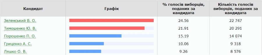Петра Порошенка підтримали 20.42 % виборців. За Володимира Зеленського проголосували 19.19 %.