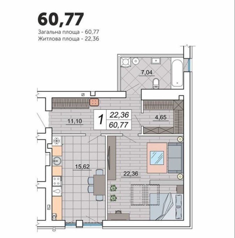 Площа помешкання становить 60, 77 м², а ціна – 11 900 грн./ м² у разі сплати всієї суми