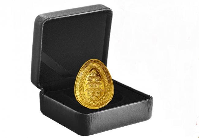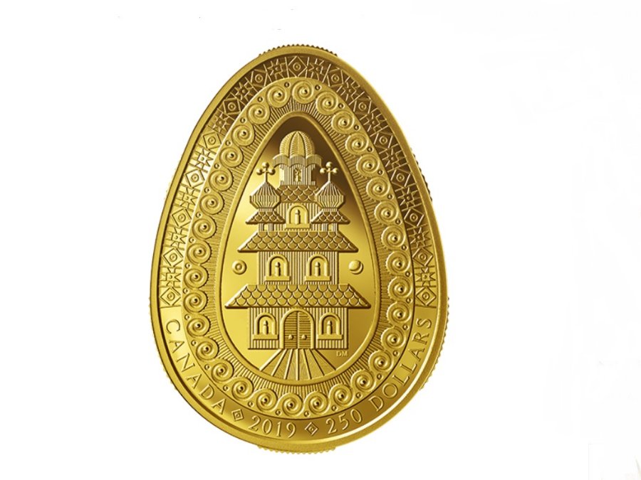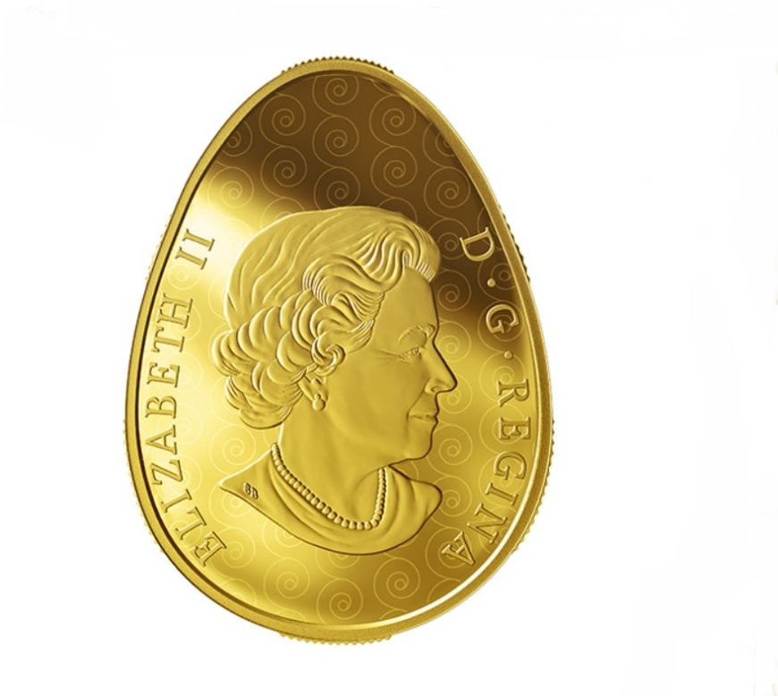 Монета у формі пасхального яйця, випущена Королівським монетним двором Канади, зроблена з чистого золота. Її вага 58,5 г. Номінальна вартість монети 250 канадських доларів, це 5053 гривень.