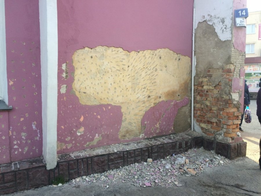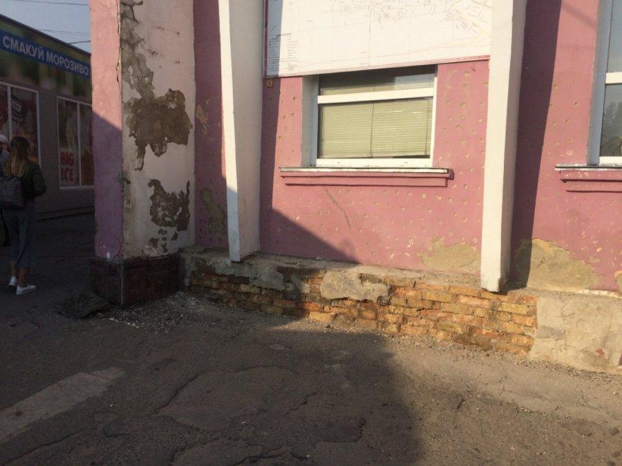 Втім, за ремонт фасаду автостанції таки взялися: зняли стару штукатурку і наносять нову.