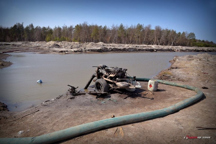 В об'єктив фотоапарата потрапили помпи, чоловіки, що працюють у воді, вимите коріння дерев і ями, які залишилися після роботи помп і тепер нагадують місячні кратери.