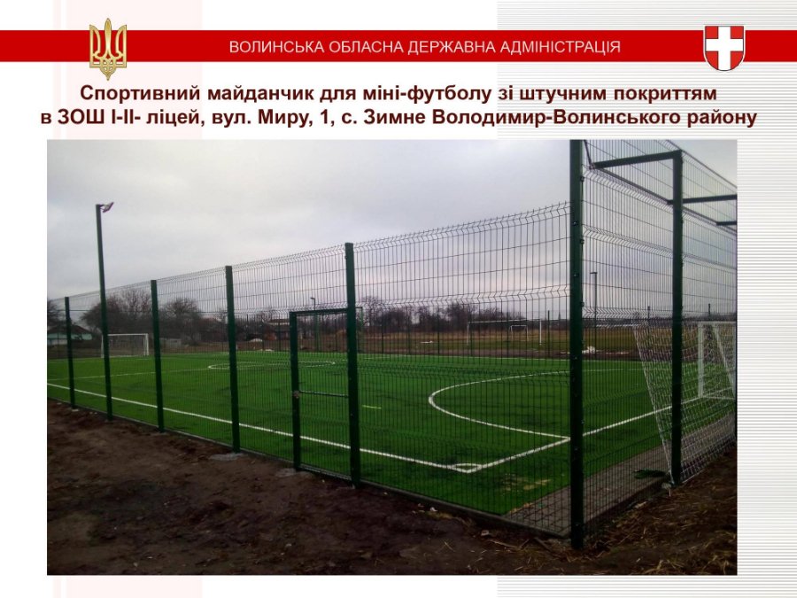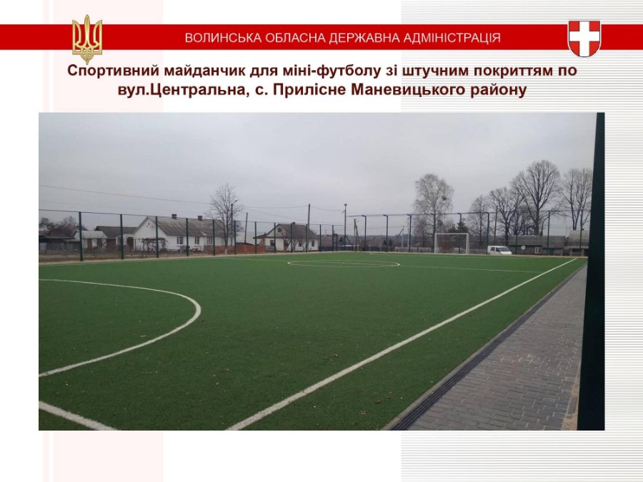 Натомість у 2019 році в області з’явиться ще п’ять футбольних полів зі штучним покриттям на загальну суму 7 млн 500,8 тис. грн. Зокрема, в с. Павлівка (Іваничівський р-н), смт Шацьк, с. Дубове (Ковельський р-н), м. Горохів, с. Липини (Луцький р-н).