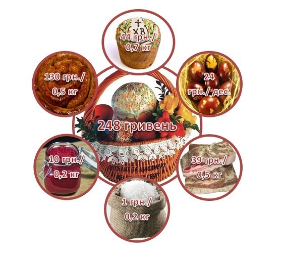 Найпомітніше подорожчали у цьогорічному великодньому кошику, крім паски, ковбаса домашня - на 13%, а також сало - на 7%. Так, паска коштуватиме 44,55 грн, півкілограма домашньої ковбаси – 130 грн, півкілограма сала – 39 грн, десяток яєць – 24 грн, 200 грамів хрону – 10 грн, а 200 грамів солі – 1 грн. Таким чином, великодній кошик обійдеться у 248 грн.