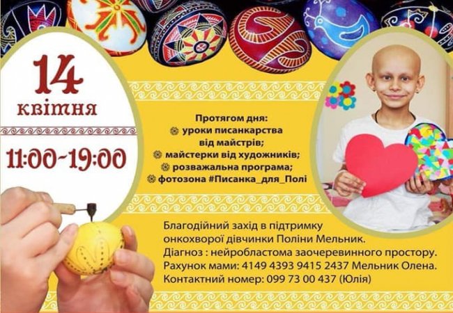 14 квітня волонтери організують благодійний захід «Писанка для Полі», на якому збиратимуть гроші для школярки Поліни Мельник із селища Цумань.