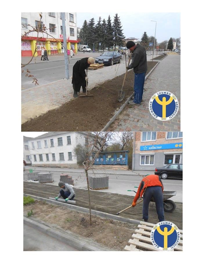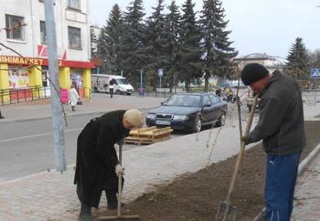 Безробітні прибирають міський парк та центр міста, де якраз укладають бруківку біля щойно висадженої алейки з сакурами, а також виконують підсобні роботи.