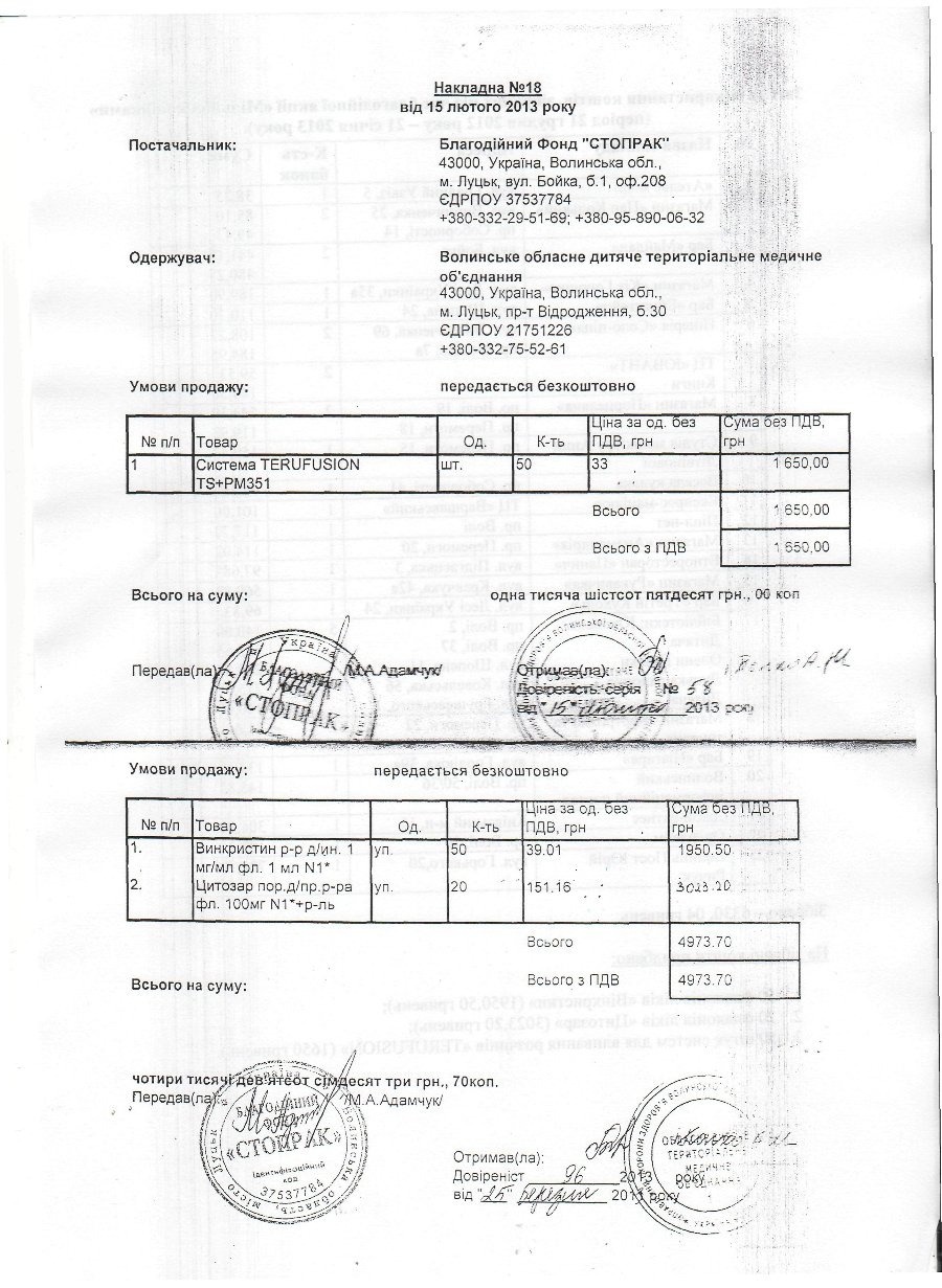 Нагадаємо, минулого разу з 20-го грудня по 20 січня 2013 року організаторам акції вдалося зібрати 6 337 гривень і 79 копійок на медикаменти для онкохворих дітей, які лікуються на стаціонарі в онкогематологічному відділенні Волинської обласної клінічної лікарні. На зібрані кошти для них придбали 50 флаконів ліків «Вінкристин» (1950,50 гривень); 20 флаконів ліків «Цитозар» (3023,20 гривень); 50 штук систем для вливання розчинів «TERUFUSION» (1650 гривень).