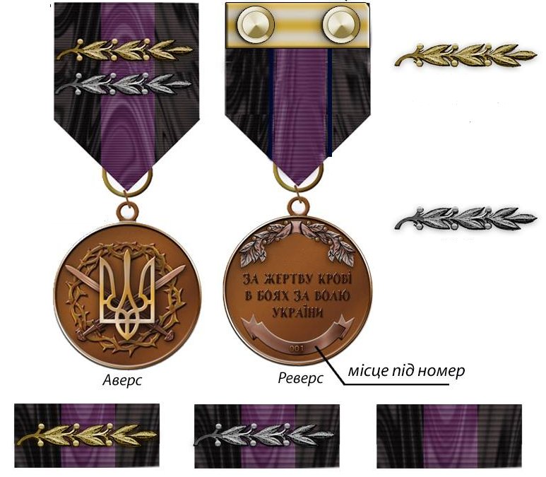 Кількість і тяжкість поранень визначається гілочками. Їх будуть кріпити на стрічці медалі або плівці – біла або срібна – для легких поранень, жовта або золота – для важких.