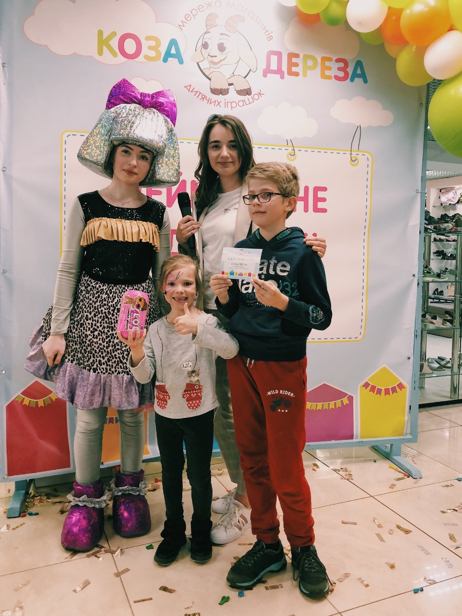 Ведуча свята разом з аніматорами провели багато цікавих конкурсів, у яких розіграли цінні призи від магазину «Коза-Дереза», а саме – оригінальну іграшку Лол, набір «Лего», грошові сертифікати на покупку іграшок та сертифікати на послуги дитячого комплексу «Смугастий носоріг».