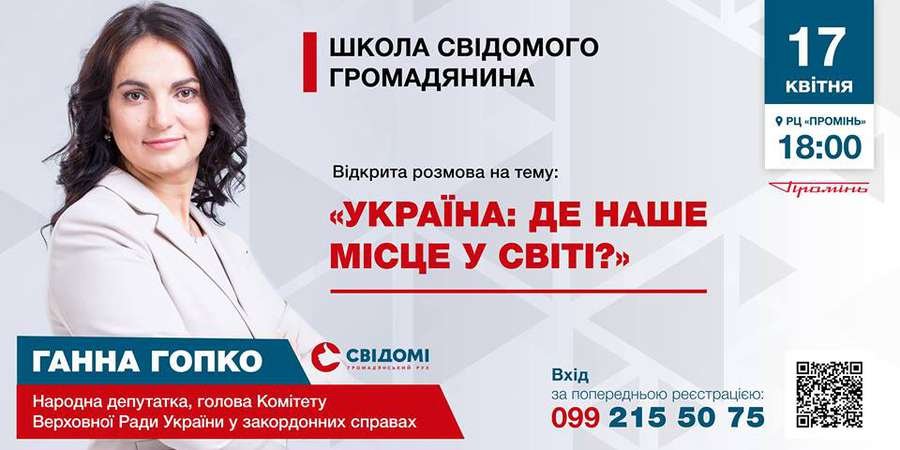 Вже 17 квітня о 18 годині у РЦ «Промінь» з лучанами спілкуватиметься народна депутатка України та голова Комітету у закордонних справах Верховної Ради Ганна Гопко.