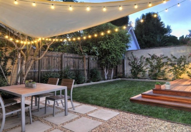 Обідню зону можна вистелити дерев’яними дошками, а навколо посіяти газон. Так трава і очі тішитиме, і не витоптуватиметься. Також задній двір можна вистелити каменем або засипати галькою.