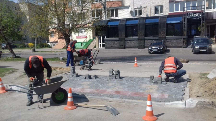 Так, розпочали роботи з влаштування посадкового майданчика на зупинці громадського транспорту та облаштування пішохідних переходів з бруківки на вулиці Кравчука в районі будинку №18.