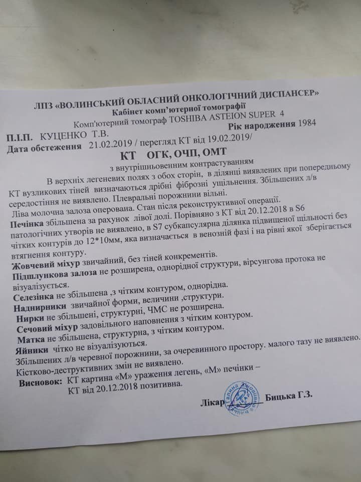 Потрібно їхати на консультацію до Києва. Тепер чекати два місяці до наступного КТ, але я вірю все-таки, що той день настане, про який я так відчайдушно мрію і метастаз не буде. Дякую, хто переживав, молився, бережи Вас усіх Боженька! ПОТРІБНА ДОПОМОГА ДЛЯ ПОВНОГО ОДУЖАННЯ!!!", - закликає Тетяна Куценко.