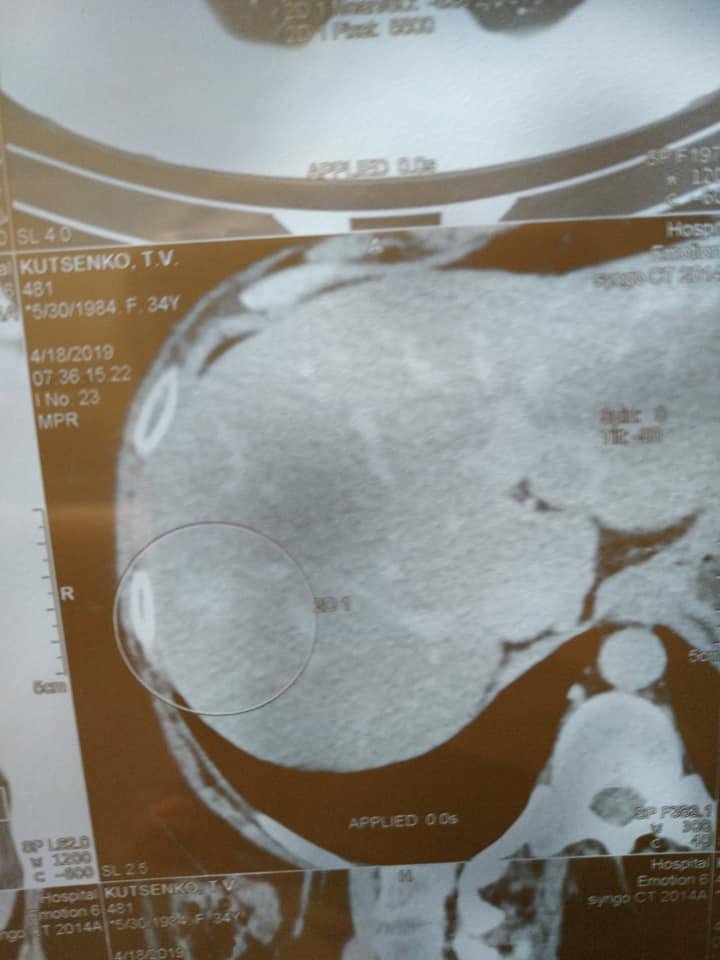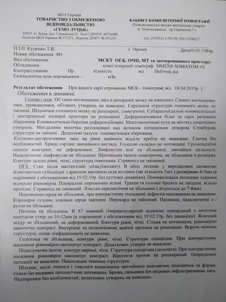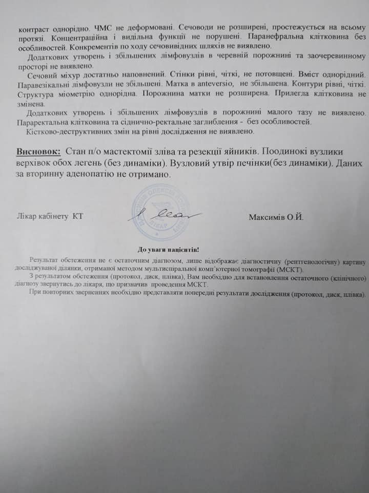 "Слава Богу, лікування допомагає, динаміка без змін в печінці, але сама структура стала з неоднорідного однорідним, так само в легенях з ареолом матового скла.
