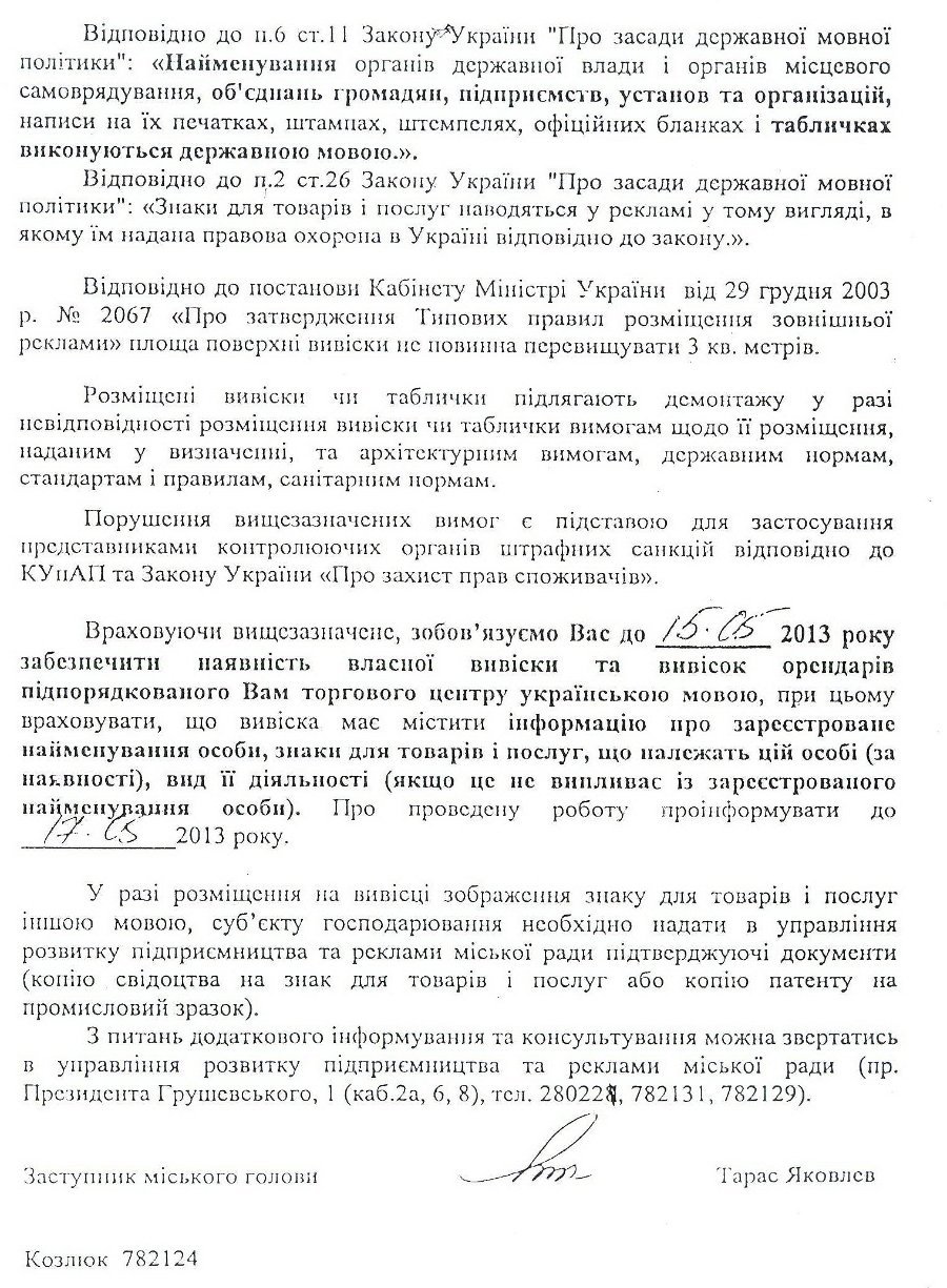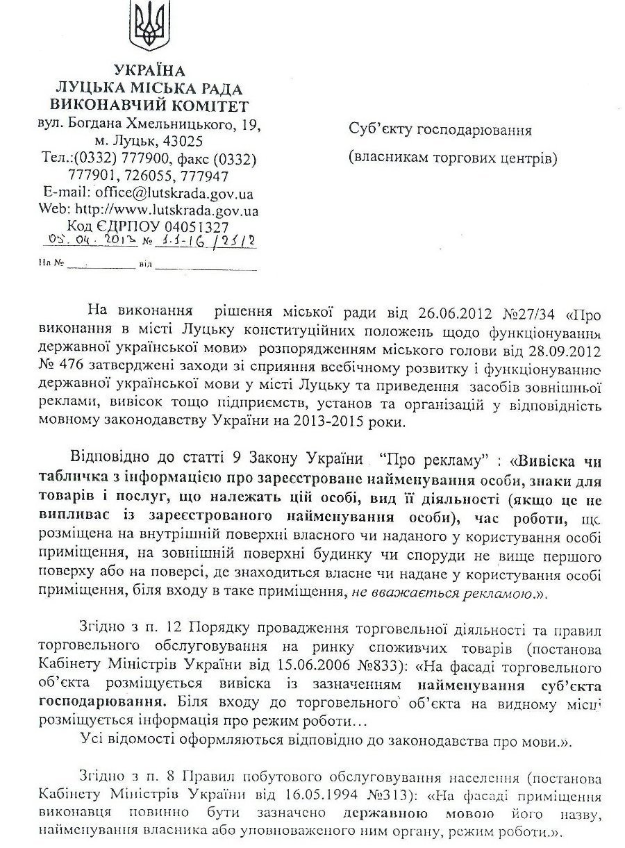 До слова, як свідчить лист, який є у розпорядженні ВолиньPost’у, суб’єктам господарювання чітко вказано, що привести у відповідність до мовного законодавства вивіски вони зобов’язані, тобто це не прохання, а вимога.