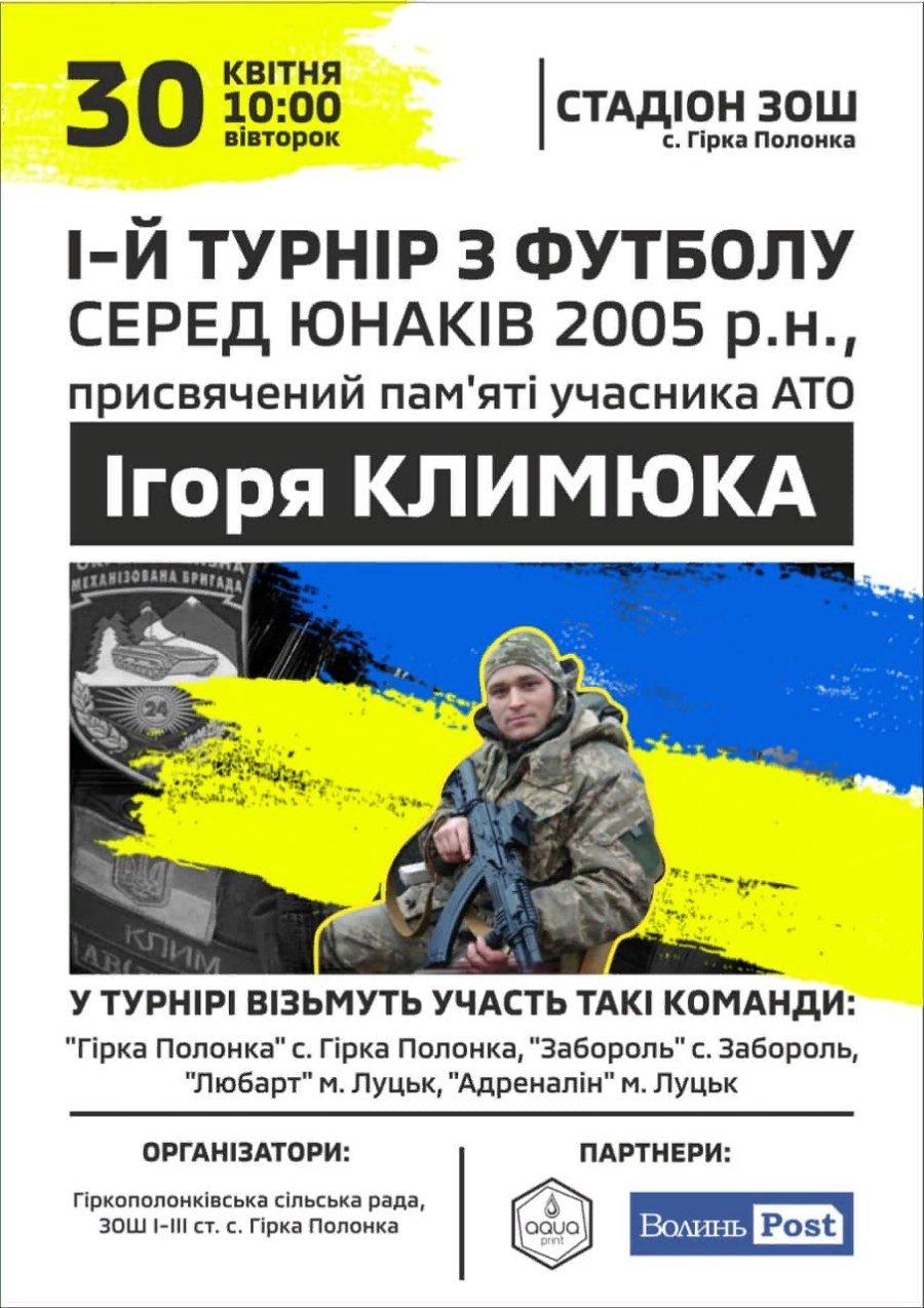 30 квітня на стадіоні ЗОШ І-ІІІ ступенів селі Гірка Полонка відбудеться І-й турнір з футболу серед юнаків 2005 р.н., присвячений пам’яті загиблого воїна АТО Ігоря Климюка.