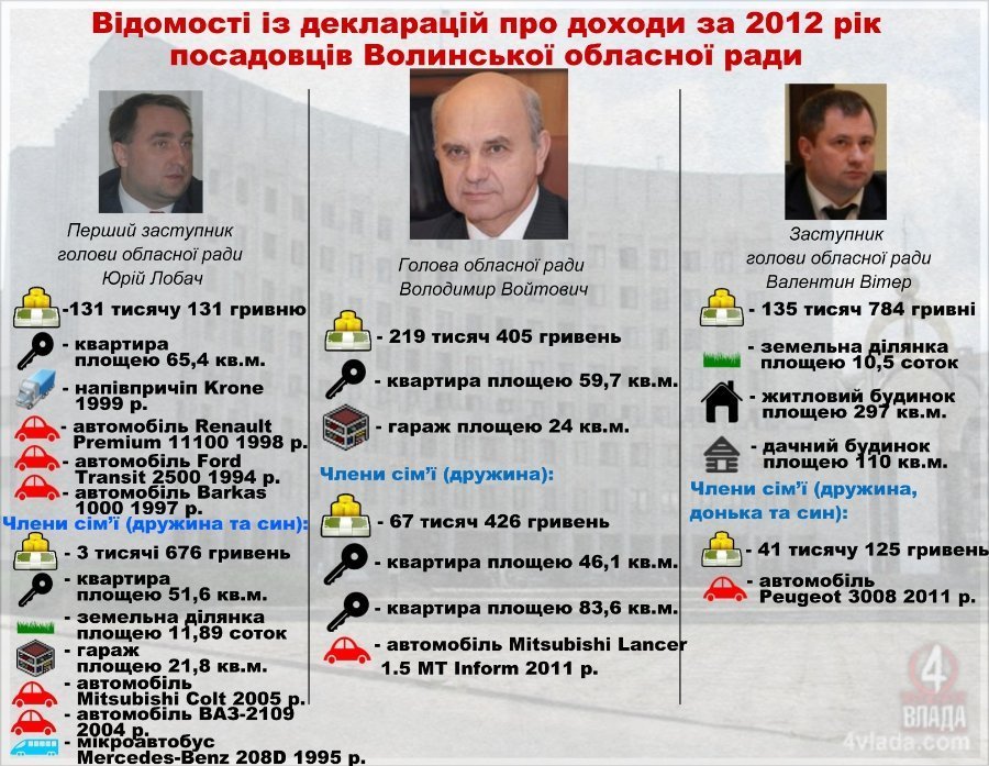 У 2012 році голова Волинської обласної ради Володимир Войтович заробив 219 тисяч 405 гривень.