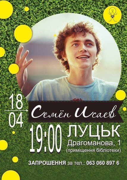 Семен Ісаєв - російськомовний поет з Білорусі. Луцьк він відвідає в межах туру Україною. В планах поета - візити в Львів, Івано-Франківськ, Тернопіль, Рівне, Житомир, Київ, Харків, Луганськ, Донецьк.