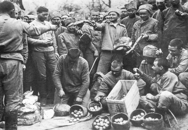 На головному фото - роздача пасок, ковбас та крашанок солдатам Сибірського полку. Спеціально до Великодня солдати та офіцери збудували Полкову церкву, яку можемо побачити на одному із фото.