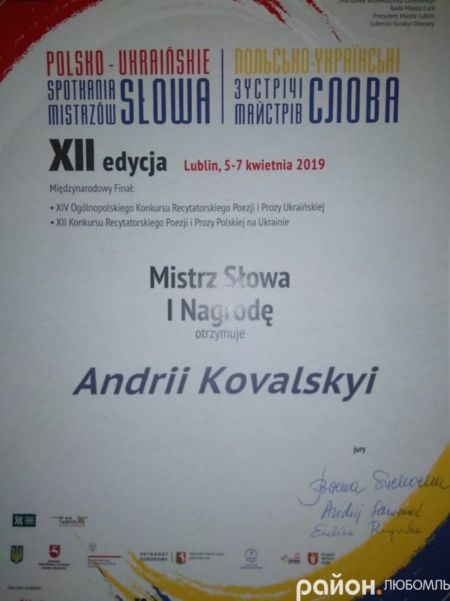 Андрій Ковальський посів I місце в категорії «Презентація польської літератури» і здобув звання Майстра слова,– пише «Район.Любомль».