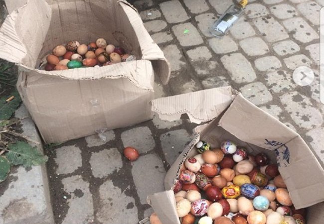 В Івано-Франківську на вулиці Млинарській знайшли неприємну знахідку. Невідомі викинули цілих два ящики крашанок, які люди в церкві жертвували на благодійність.