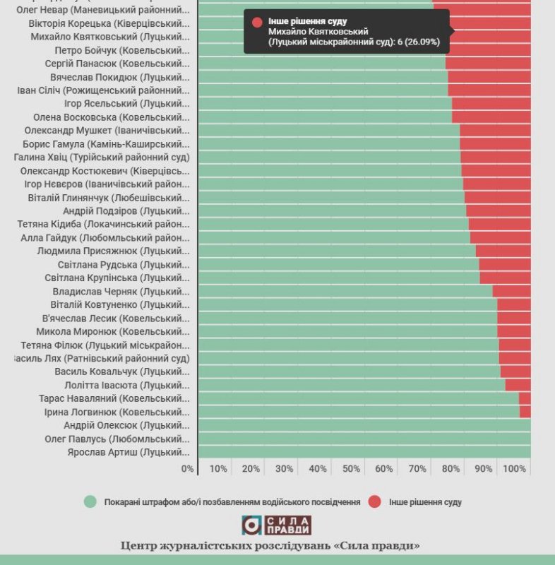 Суддя Лолітта Івасюта «покарала» 92,3% порушників, а її колега Василь Ковальчук – 90,9%.