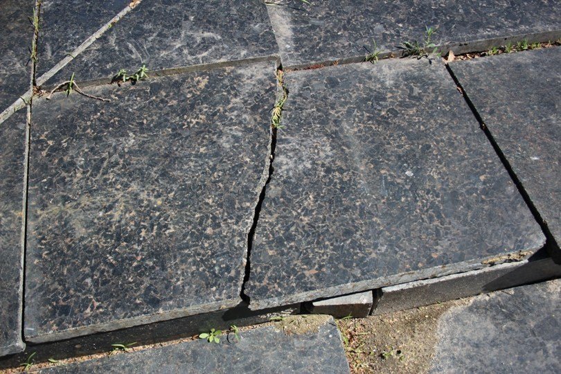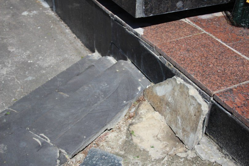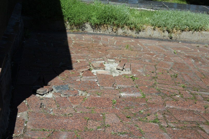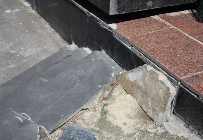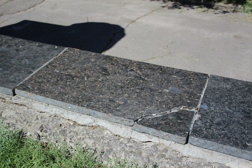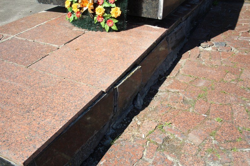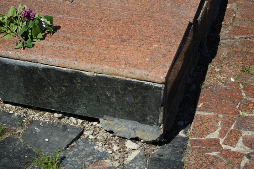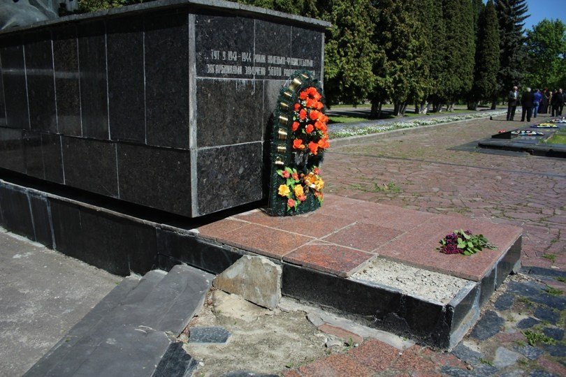 Розбиті гранітні плити, підніжжя монумента теж починає руйнуватися, від чого одна його сторона його покосилася вбік. На руці у жінки утворилася дірка, у яку залітають пташки. Про це пише Володимир Медіа.