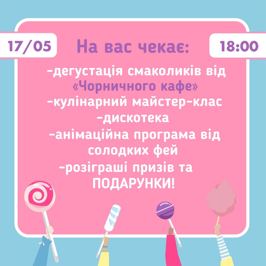 17 травня дитяче кафе «Чорничне», що на 2-му поверсі РЦ «Промінь», запрошує усіх любителів солодкого відвідати «Candy Party».
