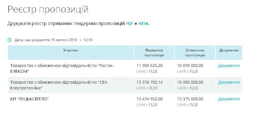 На конкурс надійшло три пропозиції, найдорожчою з яких виявилась пропозиція комунального підприємства «Луцьксвітло». Дві дешевші пропозиції надали київські підприємства:
