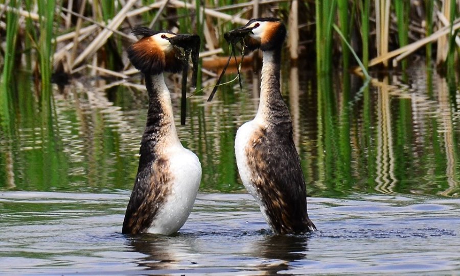 "Шлюбні ігри великих пірникоз проходять у воді, вони дуже незвичайні і мають свій строгий ритуал. Вони пливуть одне до одного, пір'я комірця розпущене, птахи трясуть головами і спливаются впритул. Потім встають у воді вертикально, в «позу пінгвіна», тримаючи в дзьобі пучки водоростей і пропонують один одному як подарунок", - йдеться у повідомленні.
