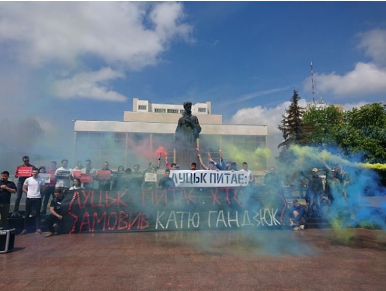 Активісти розгорнули банери з написом «Хто замовив Катю Гандзюк?» та запалили фаєри і димові шашки. Акція завершилася гімном України.