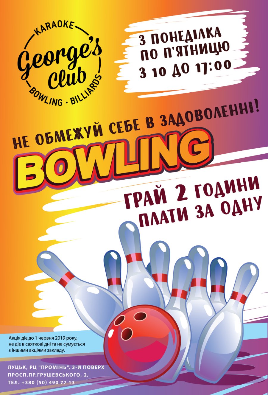 Однієї години боулінгу для веселої компанії недостатньо. То ж в George’s Club вирішили продовжити ваш відпочинок абсолютно безкоштовно. До кінця травня приходьте в George’s Club, бронюйте одну годину гри, а другу отримуйте в подарунок. Акція діє в будні з 10 до 17:00.