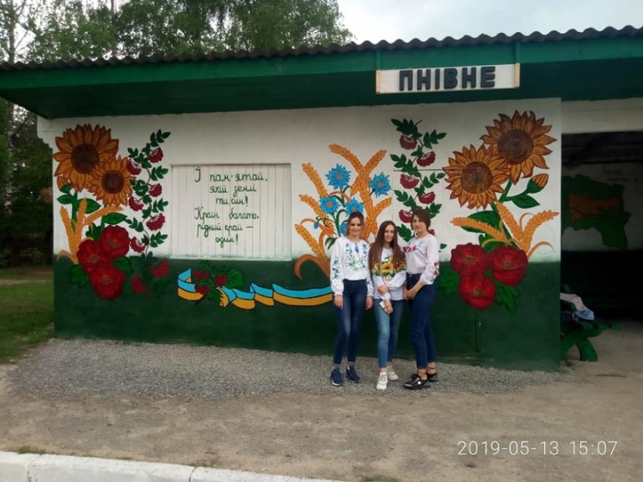 Зупинка відтепер стала справжньою «візитівкою» місцевості. Праворуч діти зобразили тризуб, обвитий жовто-блакитною стрічкою, калину та пшеничні колоски. Ліворуч намальоване традиційне українське село з шевченківською хатиною, соняхами та блакитним небом. А також – поетичні рядки тамтешнього поета Семена Дроздика про рідну місцину. На фасаді ж учні написали слова: «І пам’ятай, якій землі ти син! Країн багато, рідний край – один». А всередині зупинки зобразили карту України та Пнівненської сільської ради.