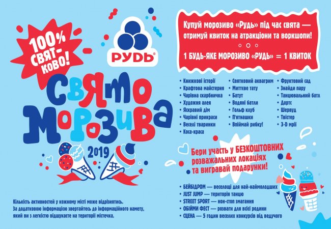 Для того, аби взяти участь у розвагах від виробника улюбленого морозива “Рудь”, варто... купувати та насолоджуватися улюбленим морозивом. Купуйте одне морозиво - отримайте один квиток на атракціон. Використайте свою можливість виграти класний подарунок! Більше морозива, більше квитків, більше подарунків!