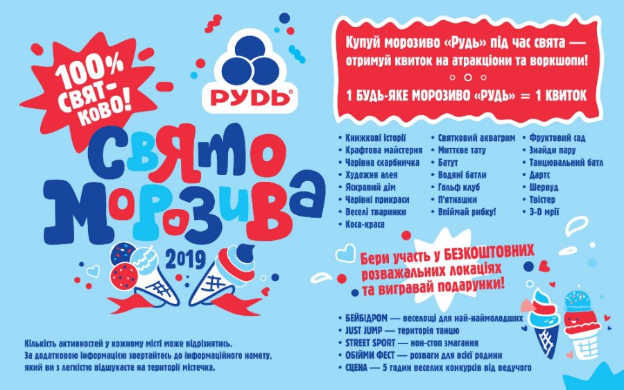 “На нашому святі є багато вільних від будь-яких умовностей локацій, куди можна прийти й розважитися на 100 %: побавитися на бейбідромі, запалити танцпол у танцювальній зоні, спробувати власні сили на зоні спортивних змагань, взяти участь у веселих конкурсах від найкрутішого ведучого! Ми робимо акцент на цінностях родини. Запрошуємо зібратися разом та прийти відпочити на «Святі морозива» від компанії “Рудь” на повну!”