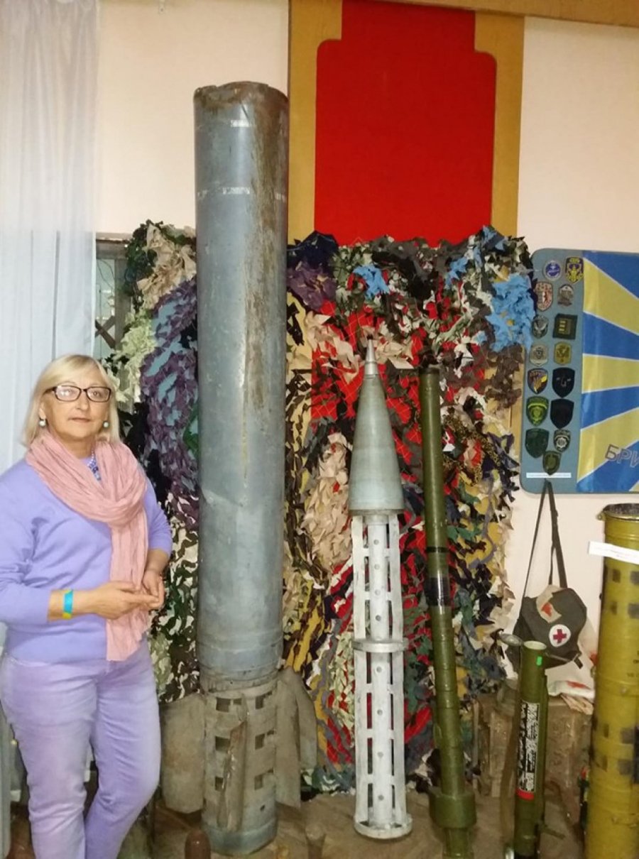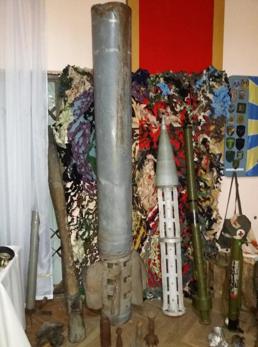 Серед експонатів – фрагменти мінометних мін 82-мм і 120 мм, контейнери від пострілів реактивного протитанкового гранатомета (РПГ-26) та протитанкового ракетного комплексу «Фагот», залишки від снаряду реактивної системи залпового вогню «Ураган» та комплектуючі переносного зенітно-ракетного комплексу «Ігла».