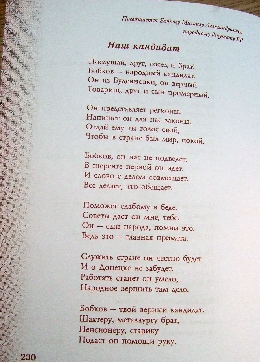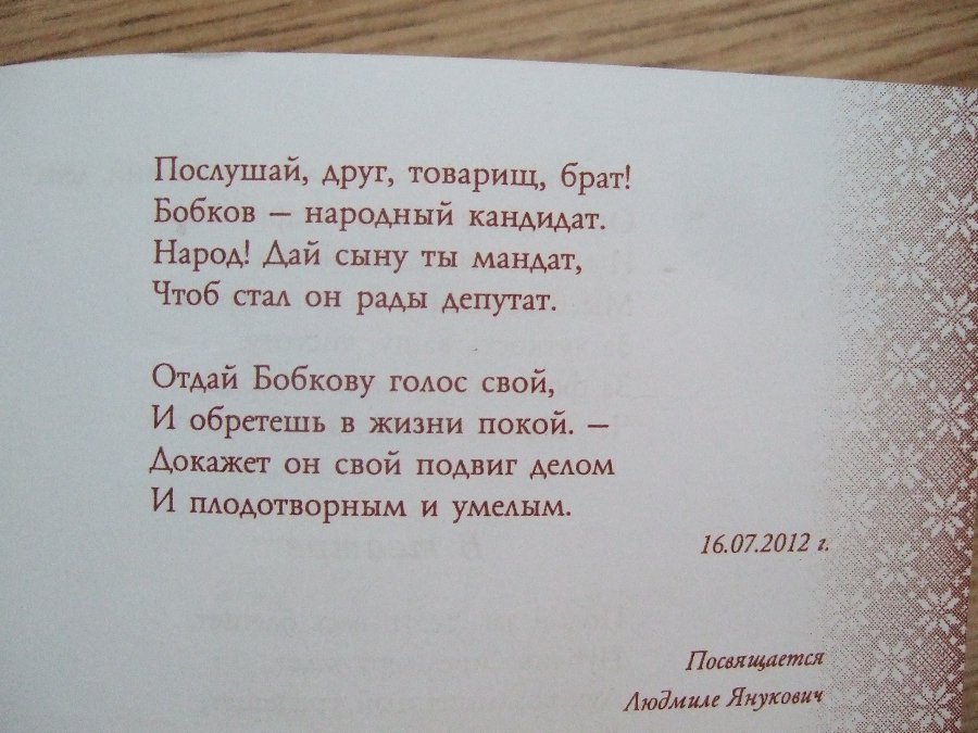 У збірнику також є вірші, присвячені народному депутату, члену ПР Олександру Бобкову.