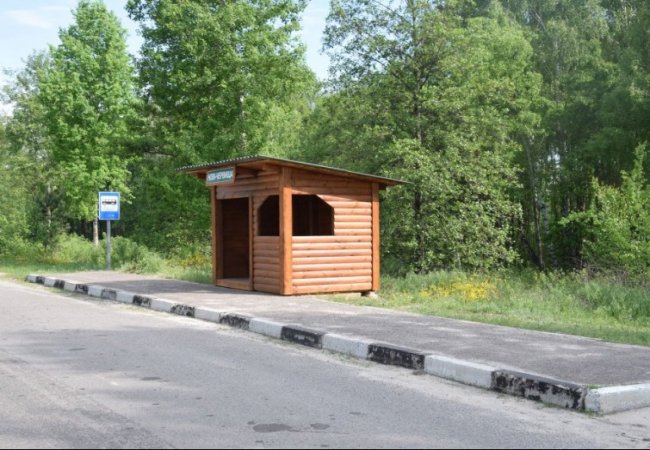 Таким чином вирішили облагородити порожнє місце, яким було раніше очікування транспортних засобів. Виготовили зупинку із дерев’яного бруса.