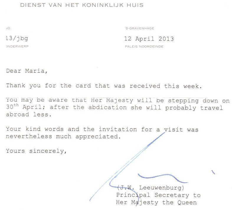 «Ваші добрі слова й запрошення здійснити візит … високо оцінені», – йдеться в листі-відповіді королеви Нідерландів.