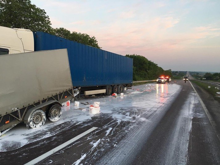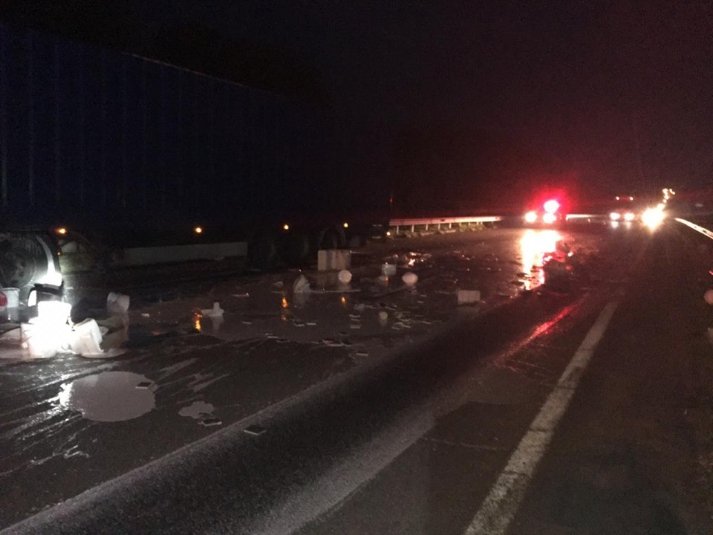 ДТП сталася о третій годині ночі 4 червня на автодорозі М-06 поблизу с.Синів Гощанського району. Постраждалих немає. На місце прибули рятувальники, які змили речовину з дороги.