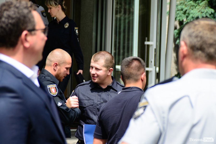Знову очікування, бо, як правило, поважні гості ніколи не прибувають вчасно. Хтось читає стрічку у Facebook, дехто скаржиться на нестерпну спеку і робить помахи кашкетом з осяянням на обличчі, мовляв, знайшов істинне призначення цього предмету екіпіровки, декотрі просто нудяться і перевіряє на міцність нерви сусіда скрипучим кріслом. Ще хвилька – запанувала тиша. Заступник голови Національної поліції України Олександр Фацевич, заступник начальника департаменту патрульної поліції Олексій Білошицький, заступник голови ОДА Олександр Киричук, в.о. мера міста Григорій Пустовіт, начальник поліції Волині Петро Шпига прибули, аби представити головного патрульного Волині – Андрія Крутня.